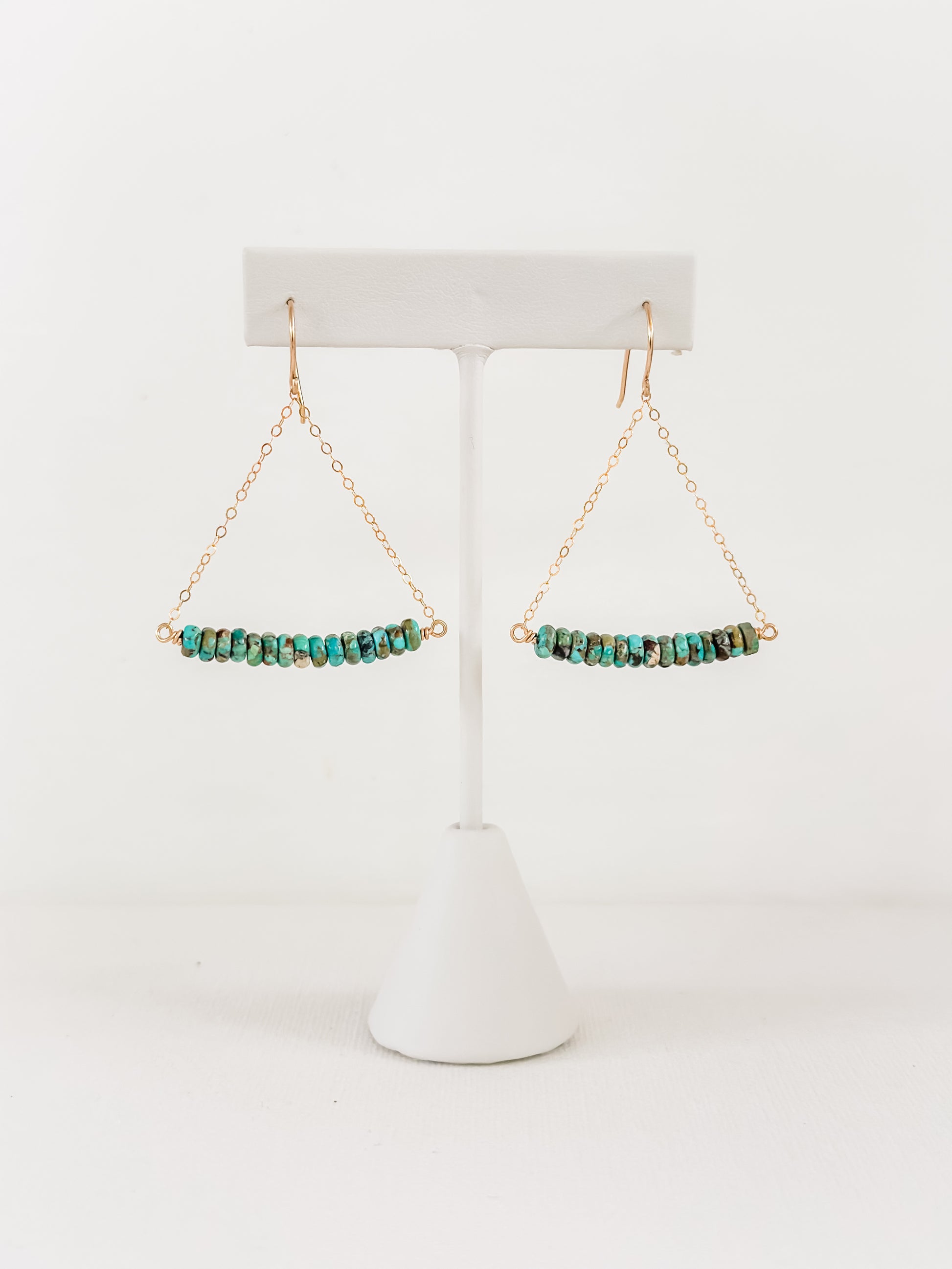 Elegant yet earthy, the Calico Earrings are designed for the modern bohemian spirit. A strand of turquoise stones floats between 14k gold filled chains creating a soft triangle shape that reminds us of the natural beauty of the desert.