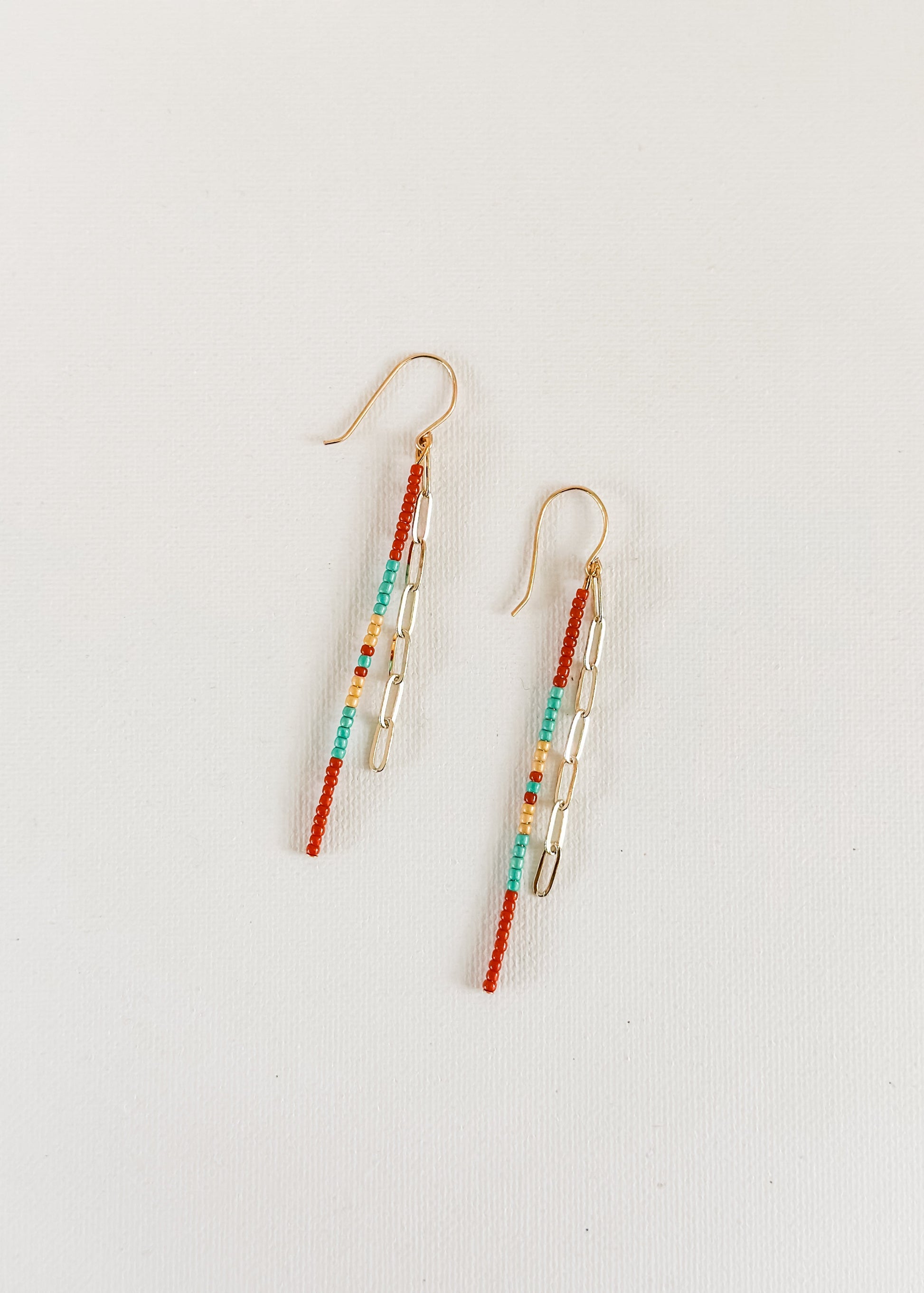 The Cheyenne Earrings capture the spirit of desert sunsets and dusty highways blending hues of rust, turquoise, and gold with bohemian style. Delicate gold-filled chain links add just the right touch of shine, creating a look that moves with you from day to night.