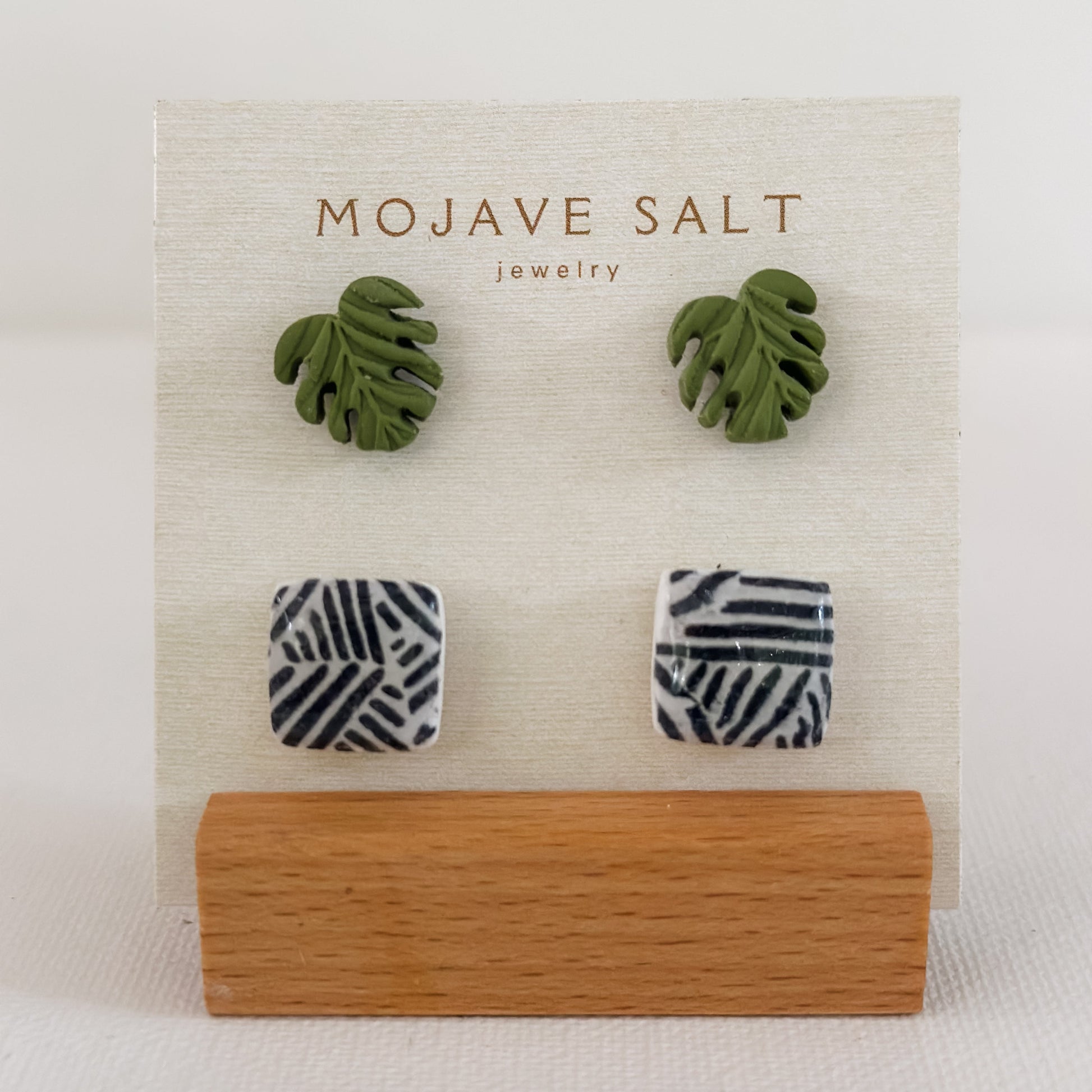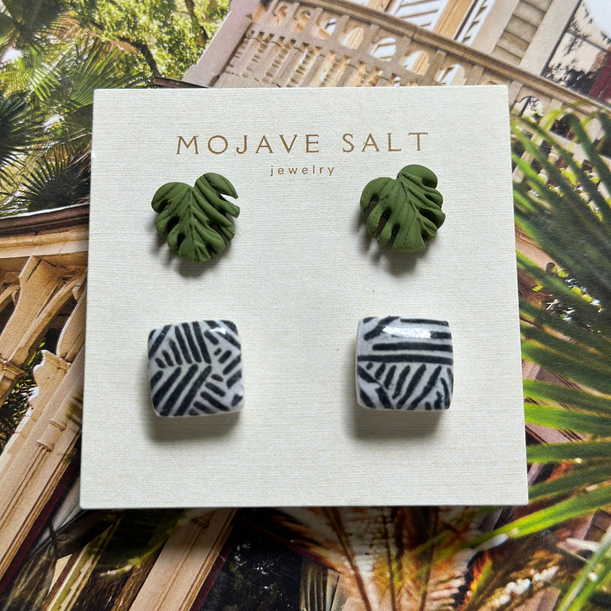 - Includes a pair of monstera studs + one pair black/white tile studs