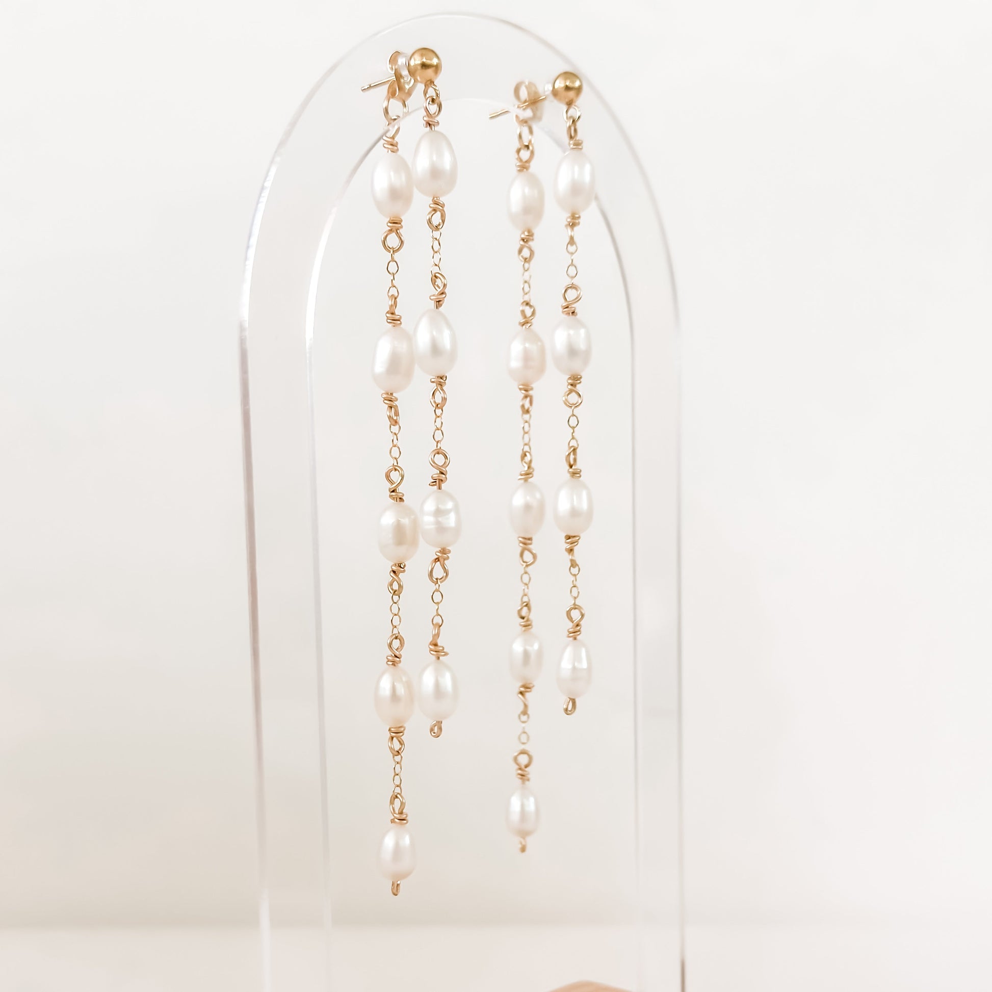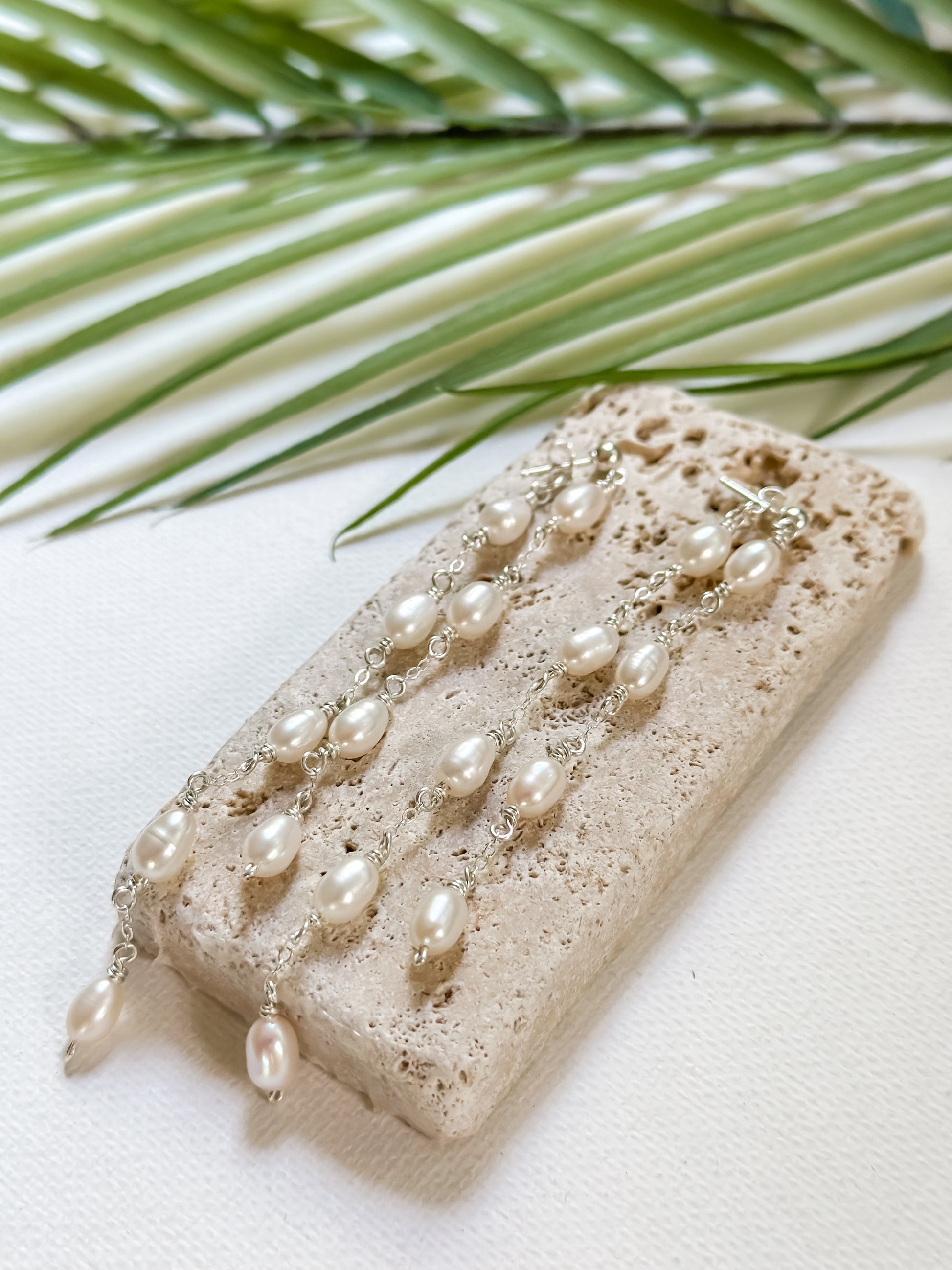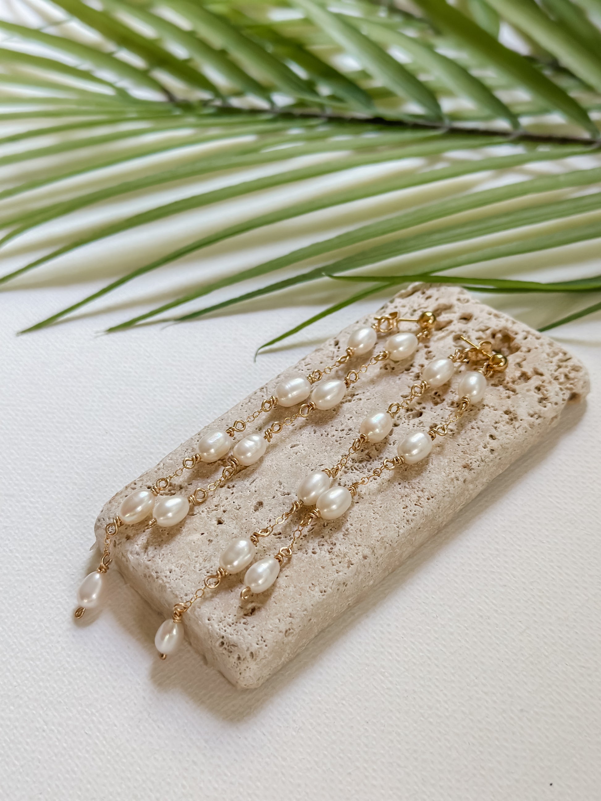 Elegant and flowing, the Miramar Earrings feature strands of natural freshwater pearls cascading from delicate chains. Inspired by ocean views and soft light, they bring a romantic, graceful finish to any look. Available in gold-filled or sterling silver.