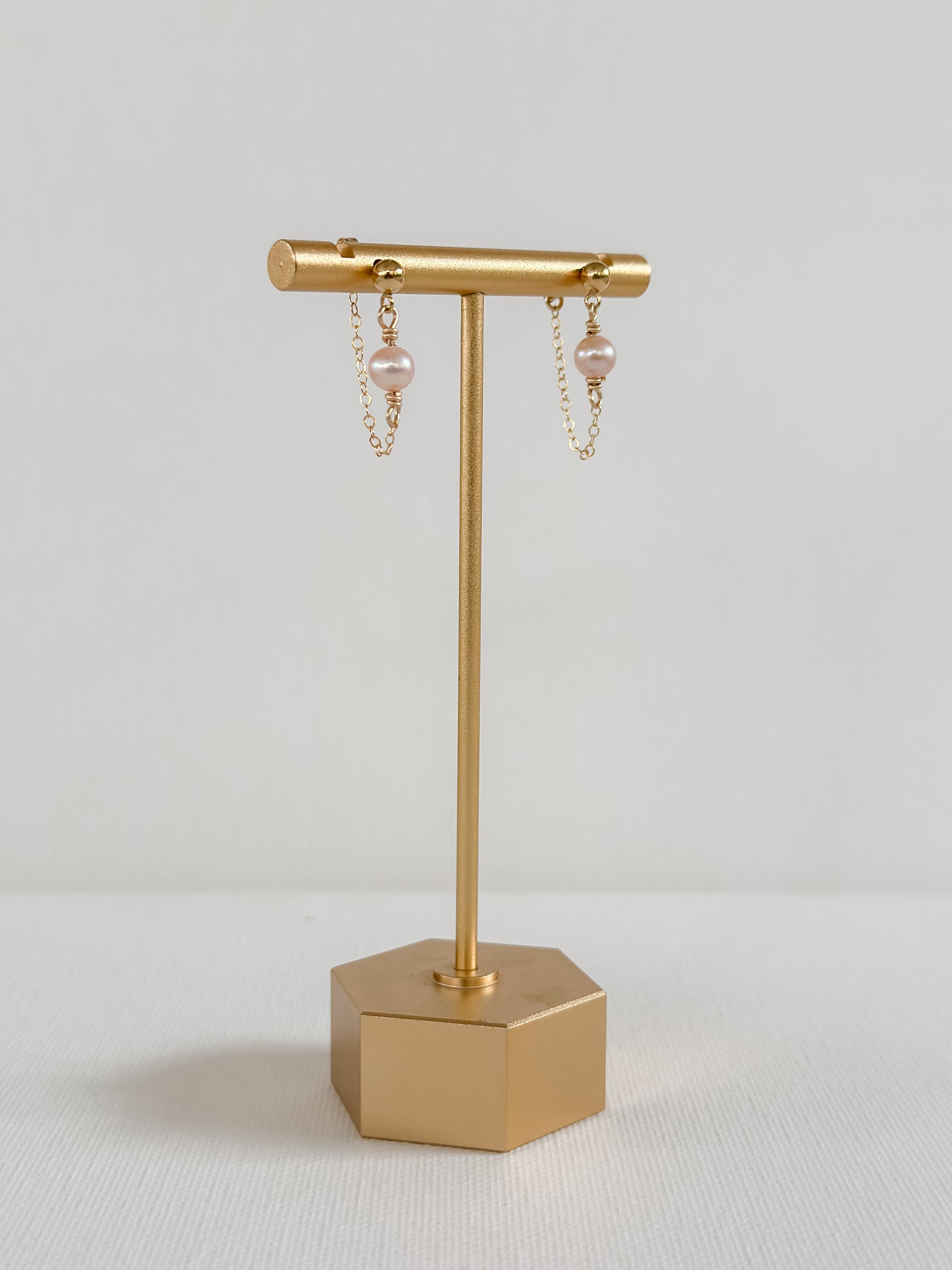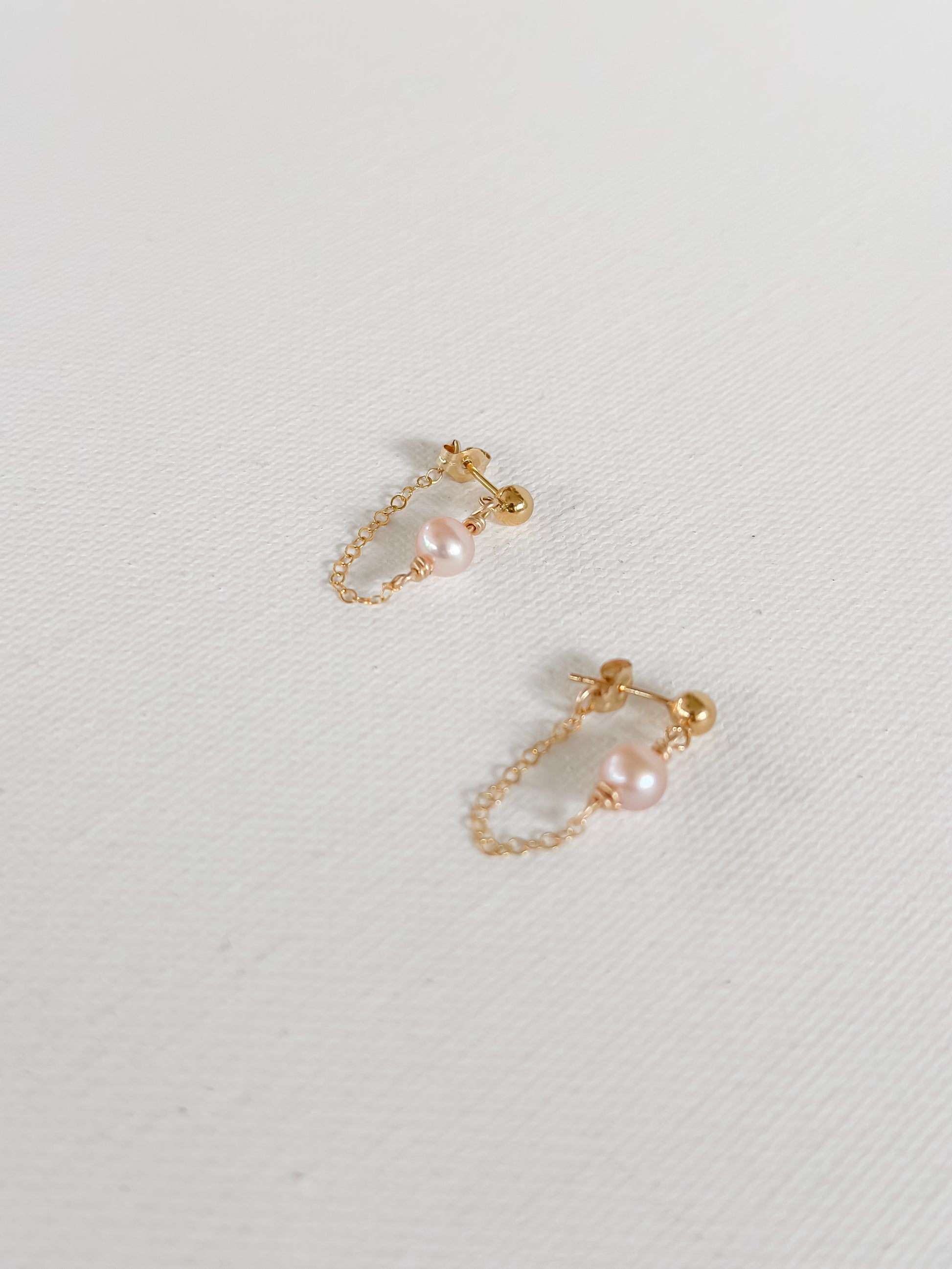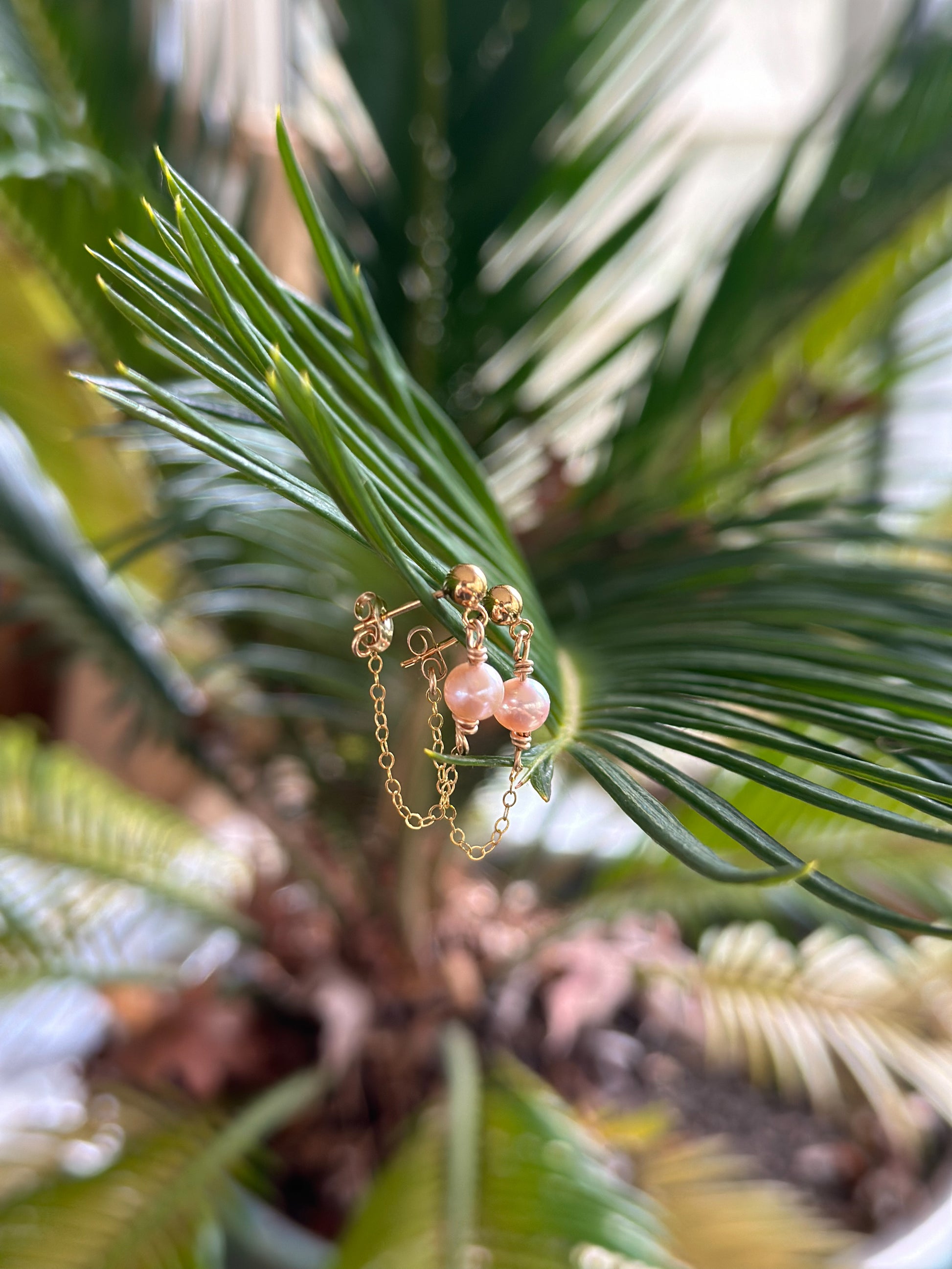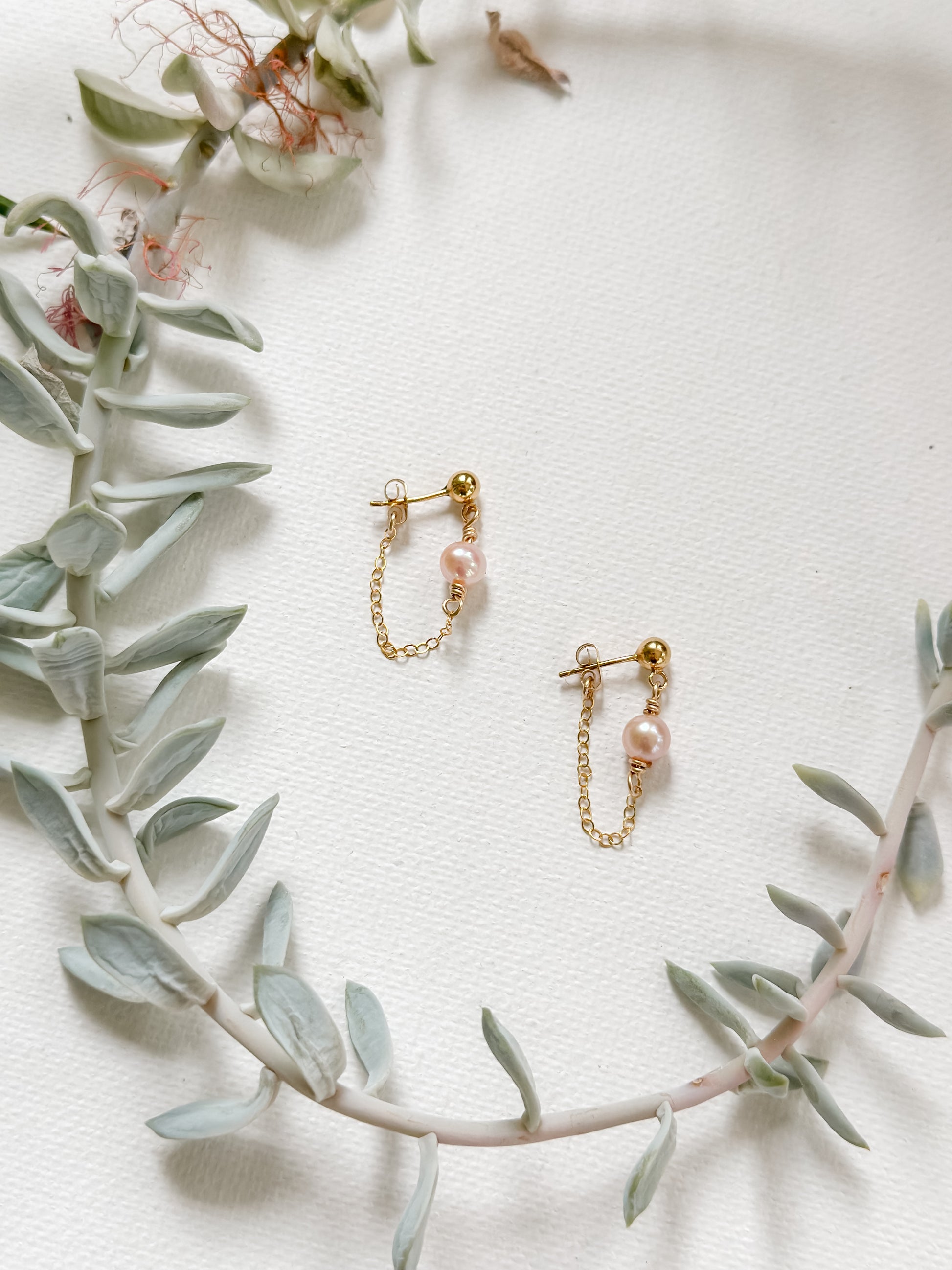 A one of a kind chain style huggie with an edgy and classic look. Made with blush pink pearls to give it a whimsical modern twist.