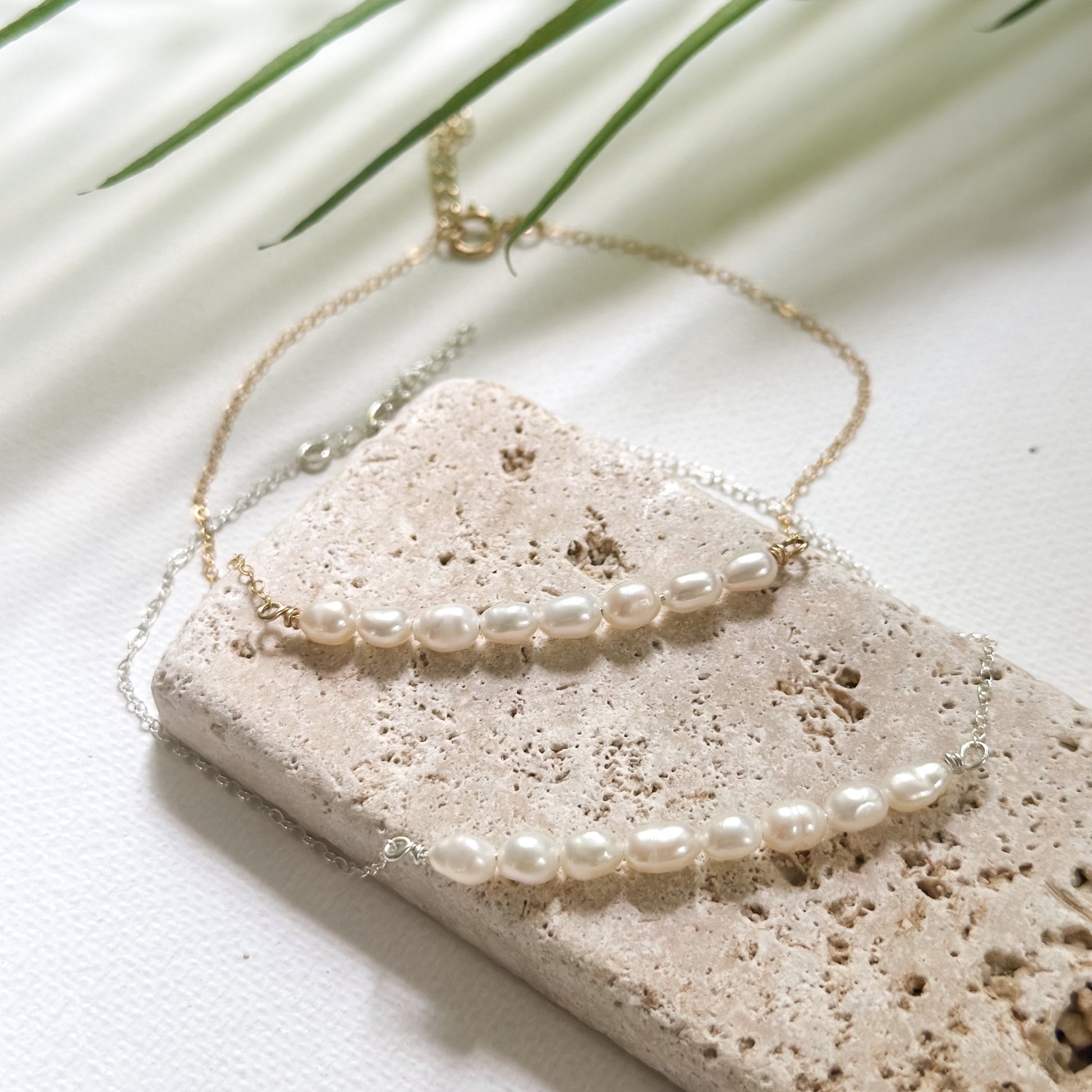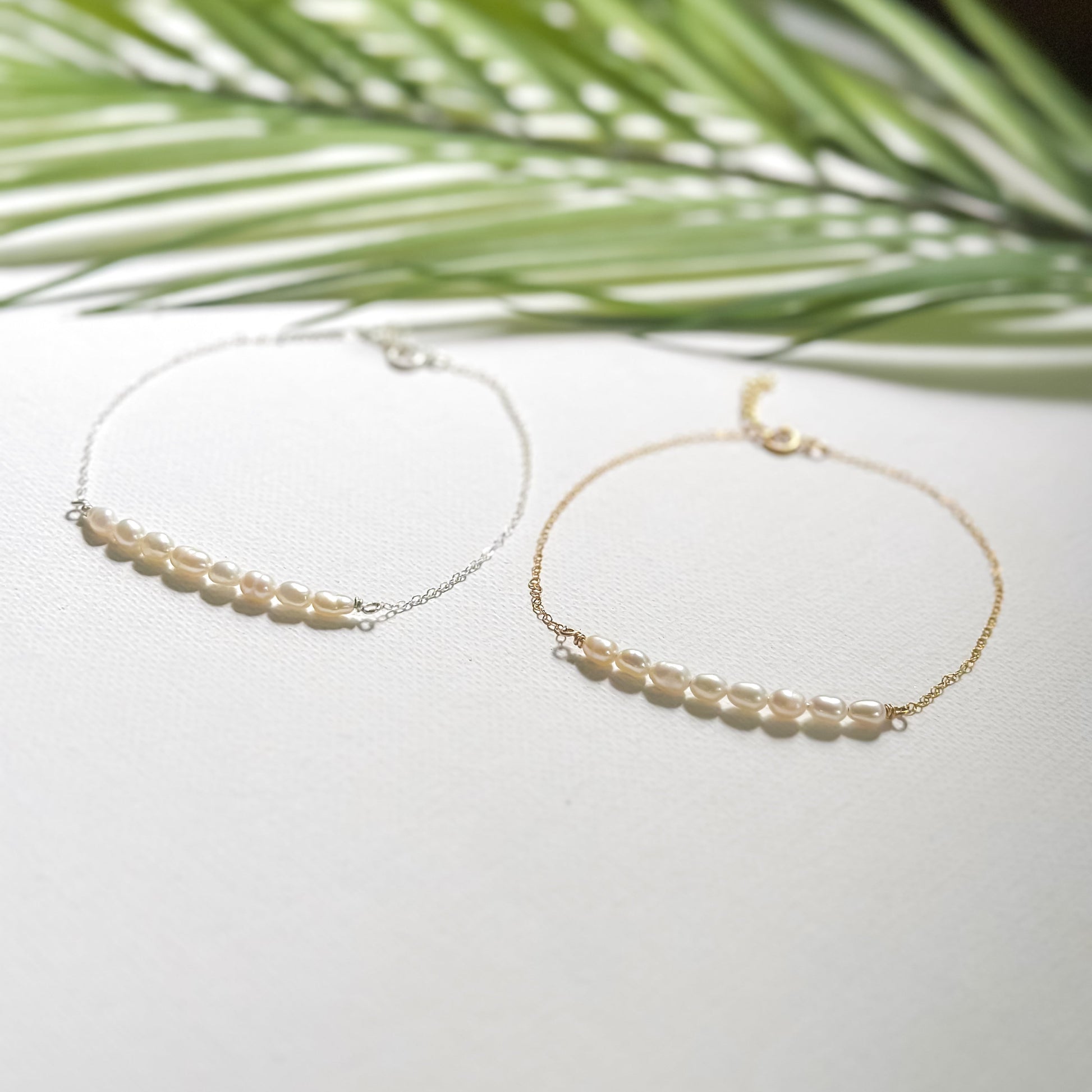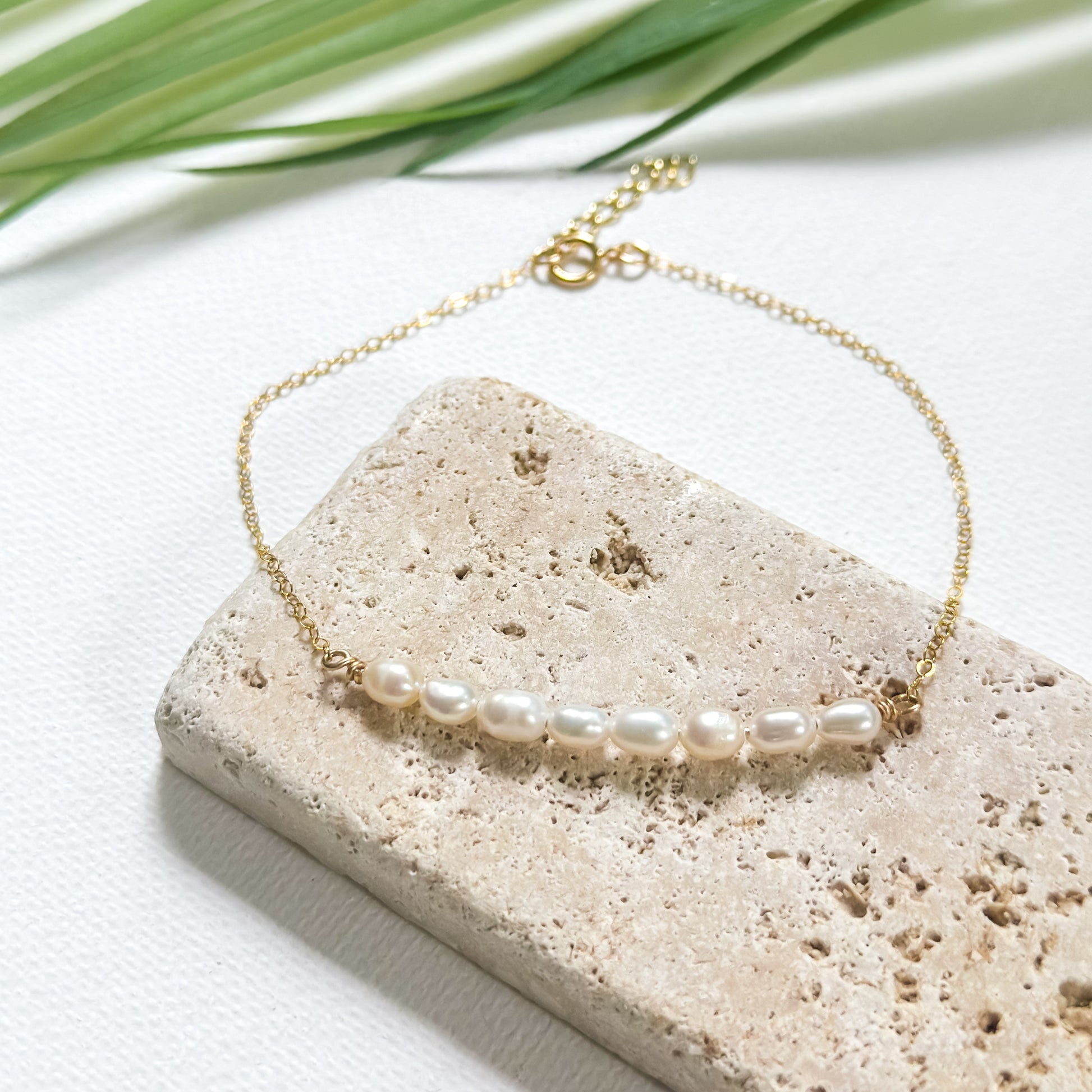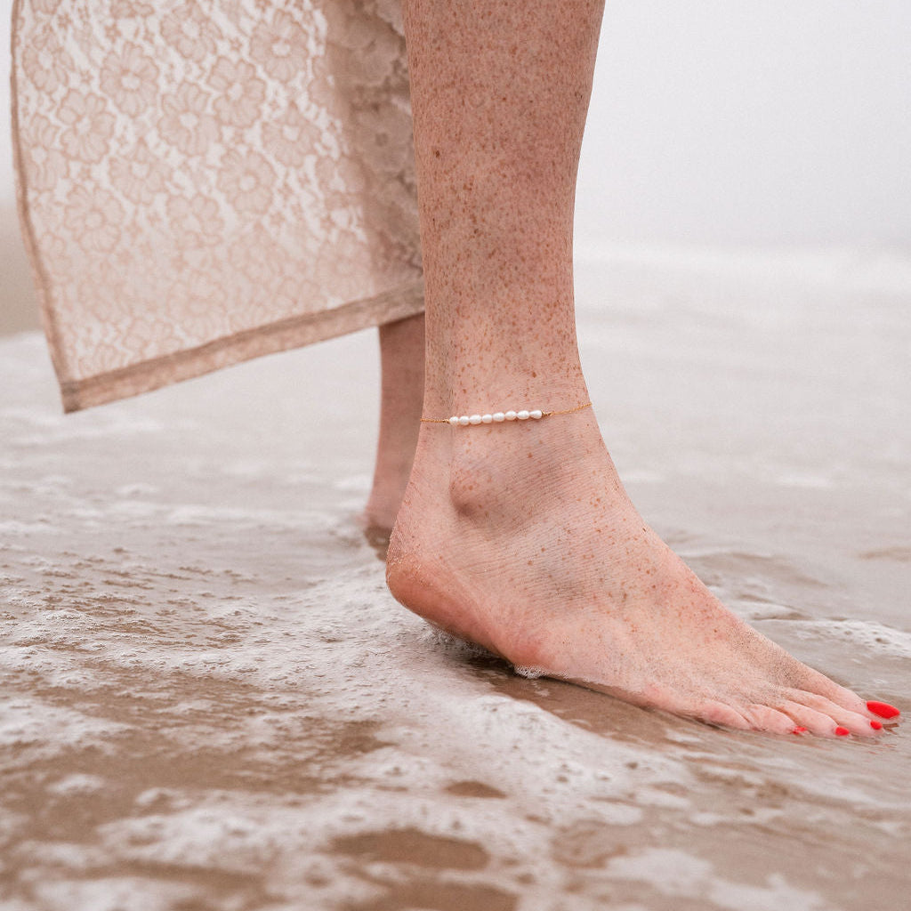 A barefoot essential. The Skye anklet features a soft arc of petite freshwater pearls on a dainty chain—beachy, elegant, and easy to wear from sunrise to golden hour. Made in both gold-filled and sterling silver to keep up with salty days and sandy toes.