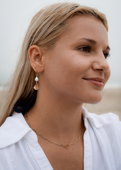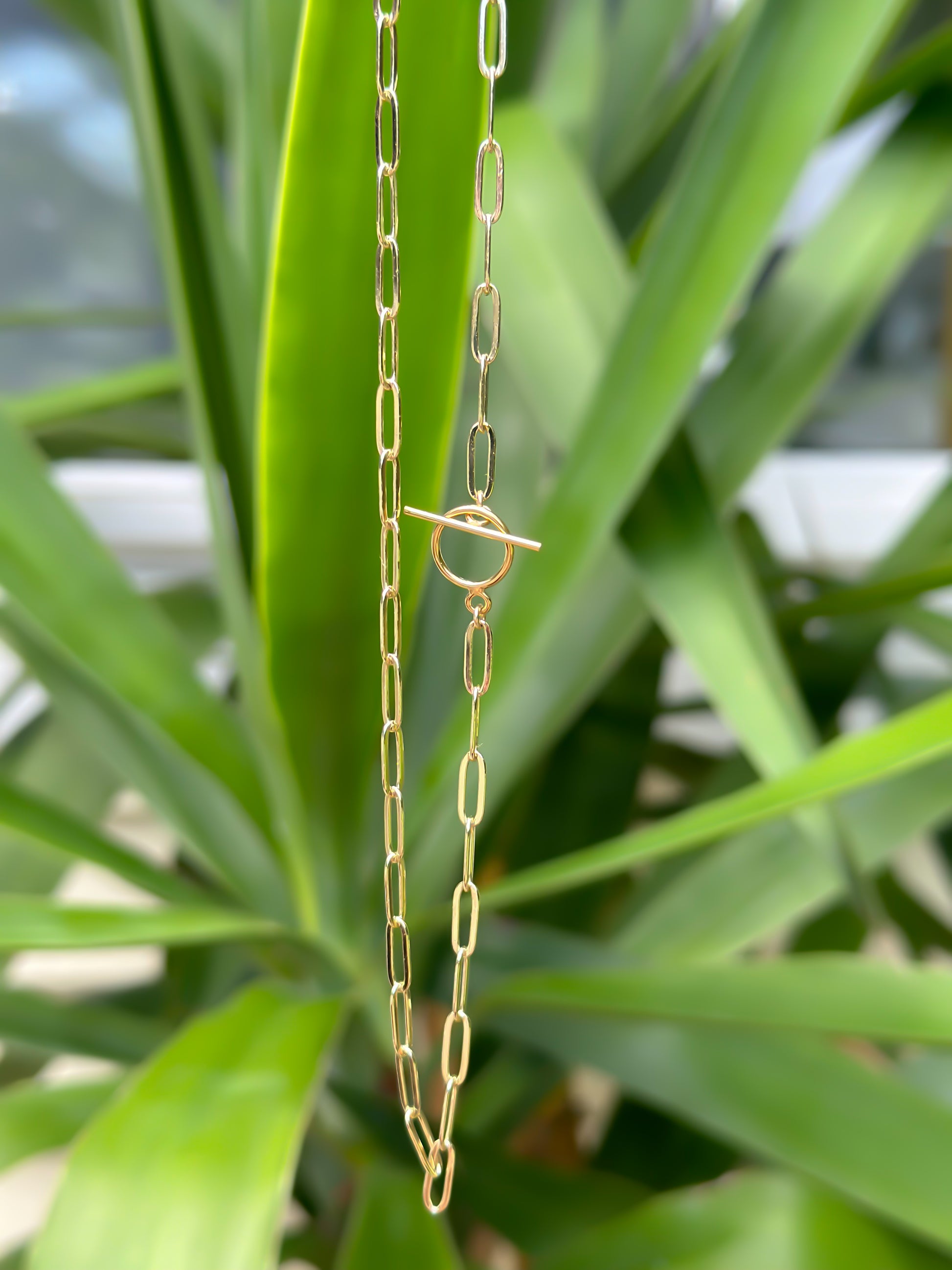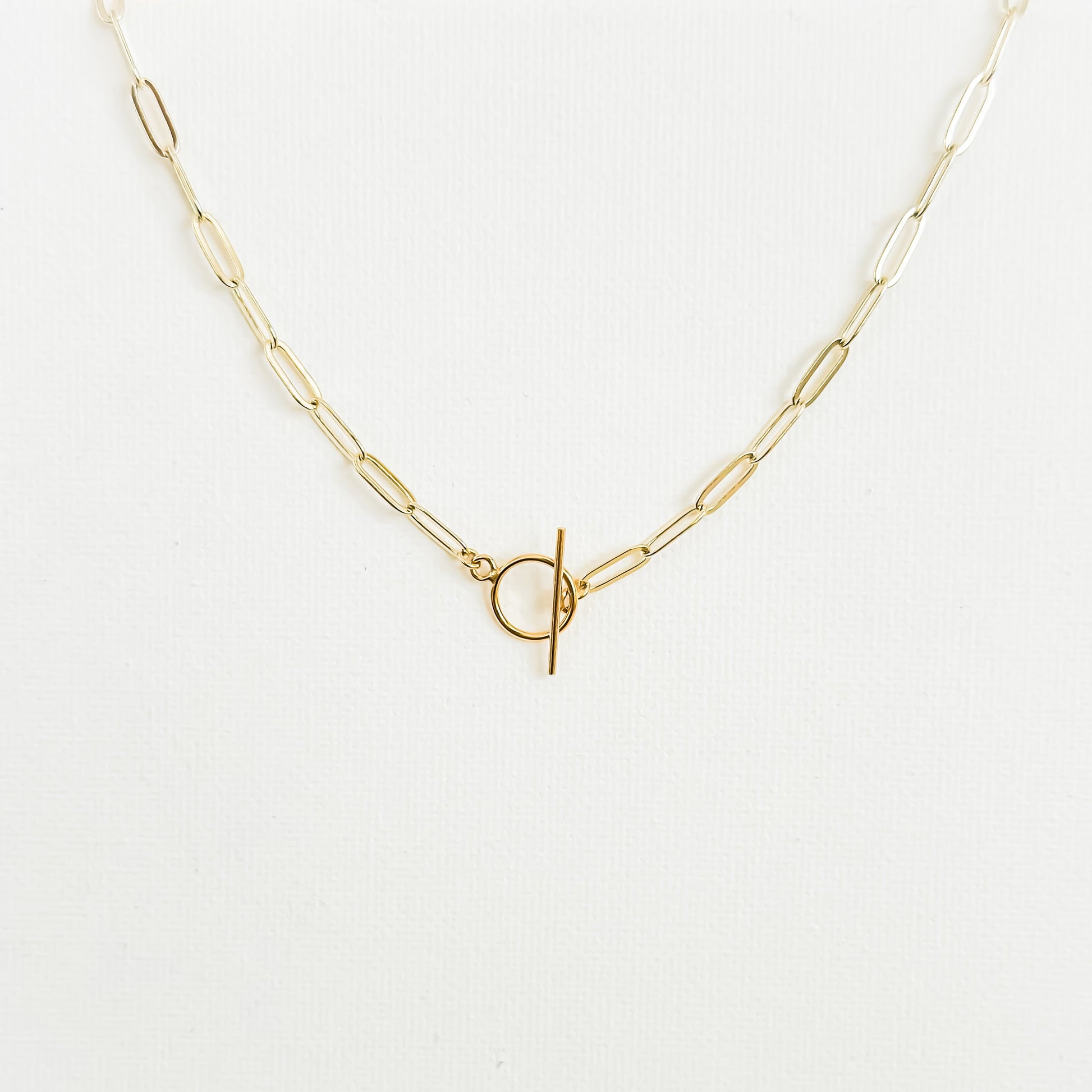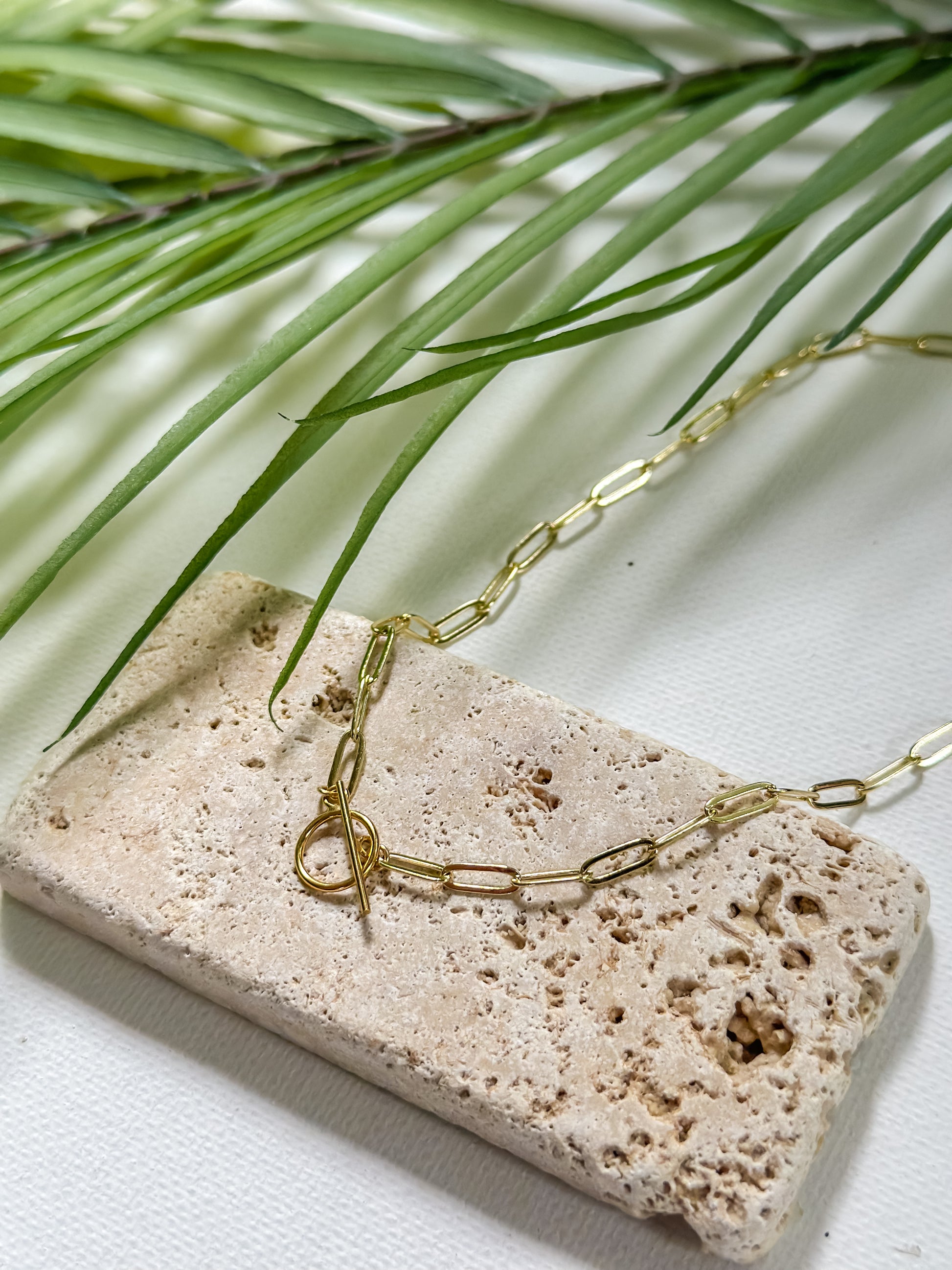 Bright, effortless, and golden like the sun. The Sol Necklace features a bold paperclip chain and toggle clasp, designed to catch the light and elevate any look. Worn solo or stacked, it’s your go-to for that sunkissed glow.