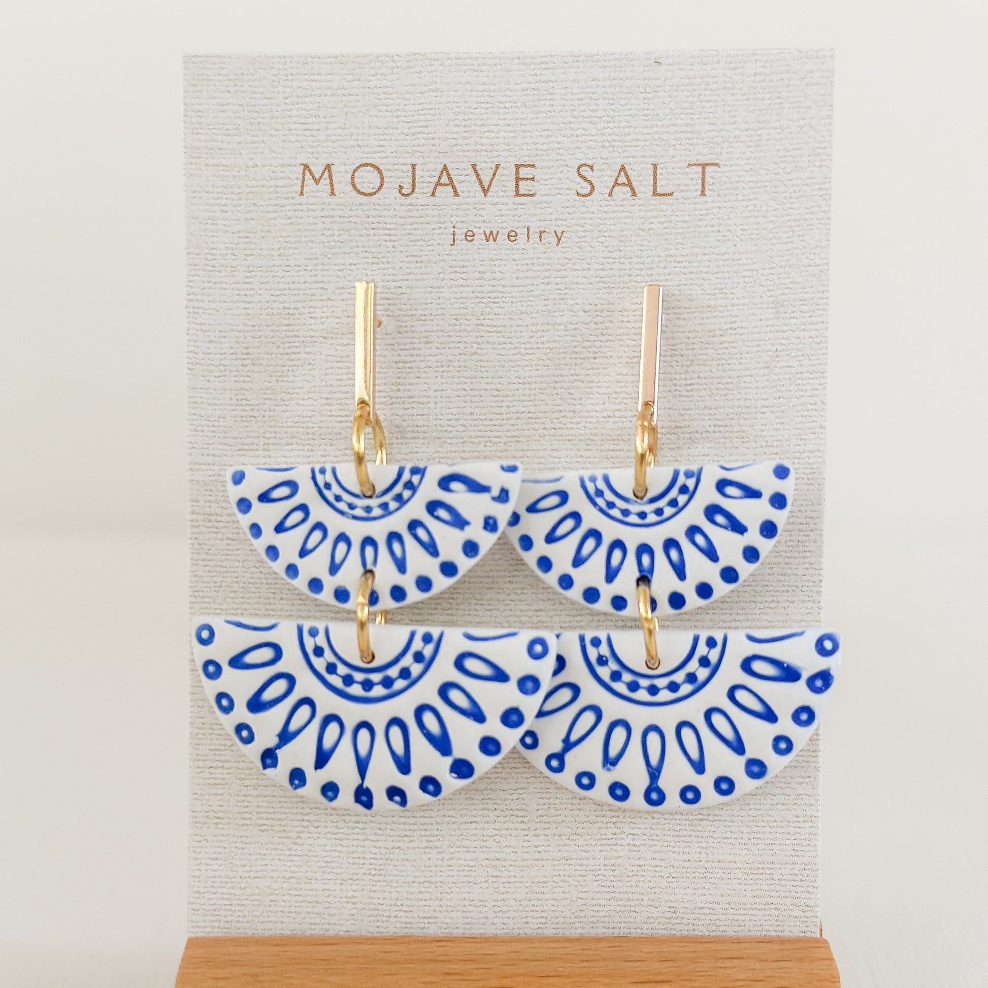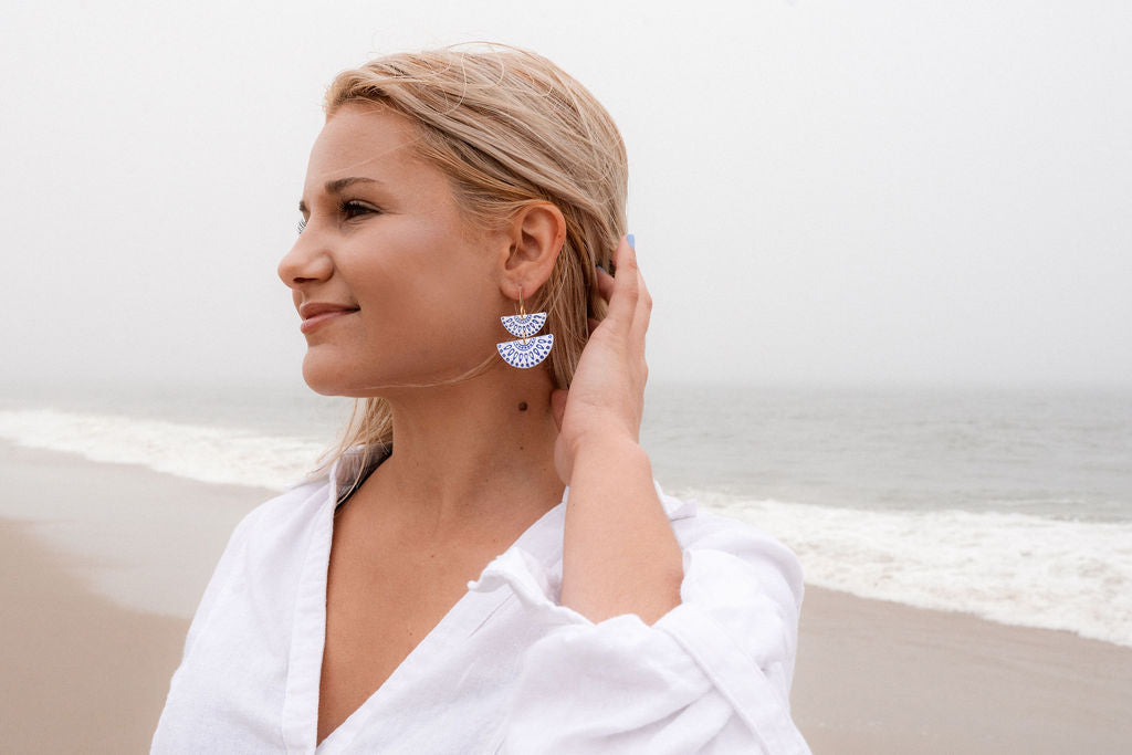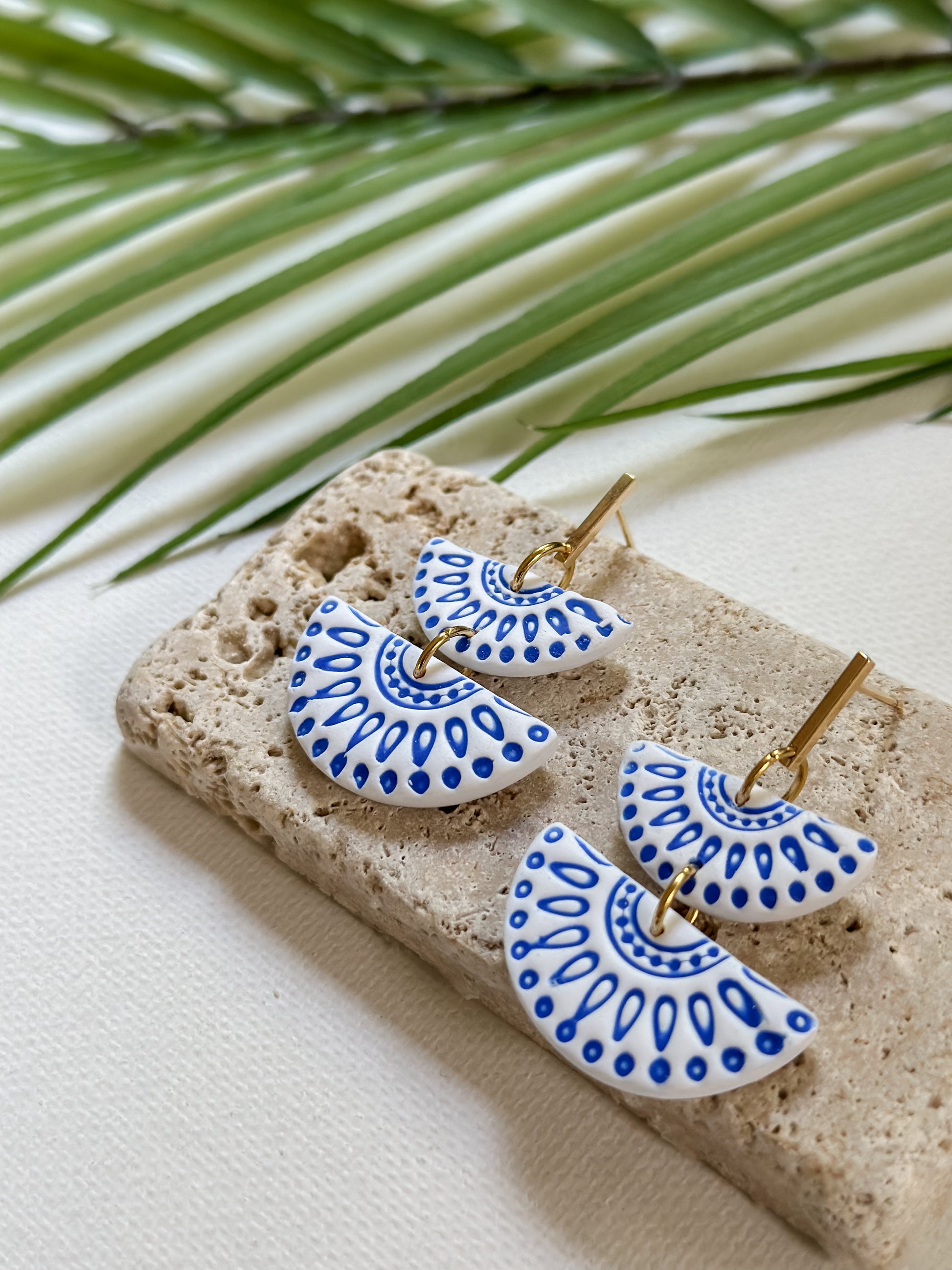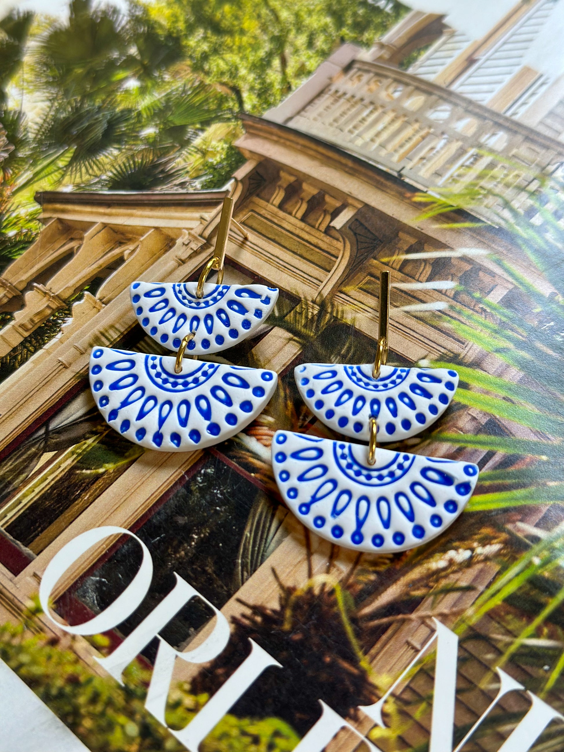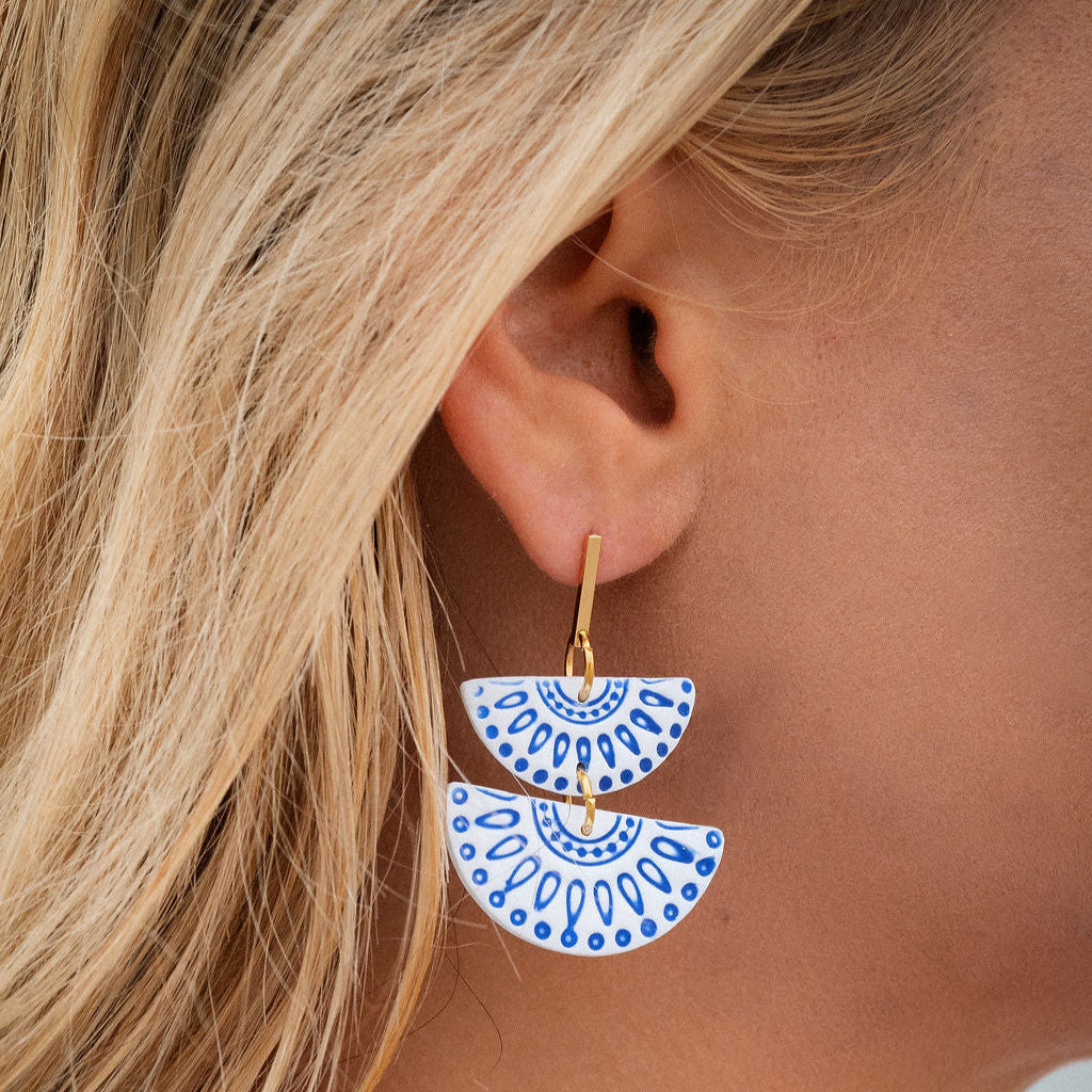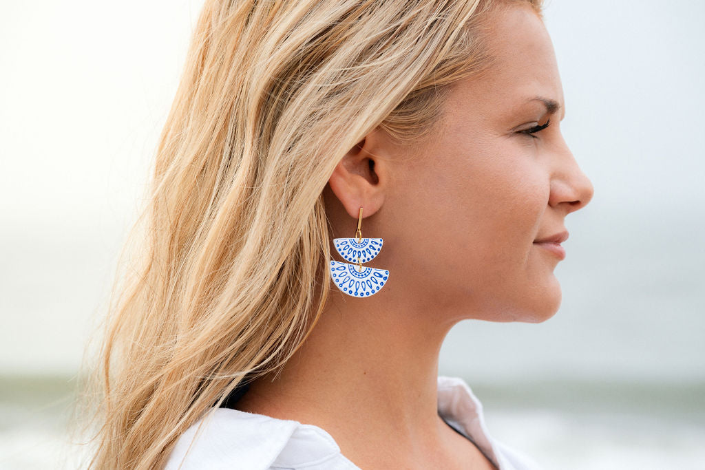 Inspired by hand-painted Spanish tilework, the Azula Earrings bring old-world charm into modern form. With their bold cobalt pattern and fan shape, they’re a wearable ode to blue skies, ocean breezes, and the vibrant soul of summer in Spain.