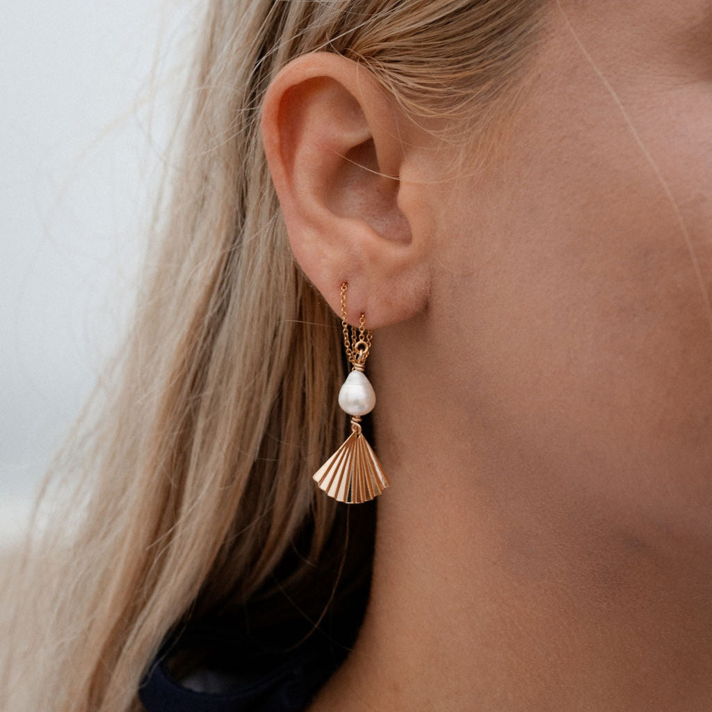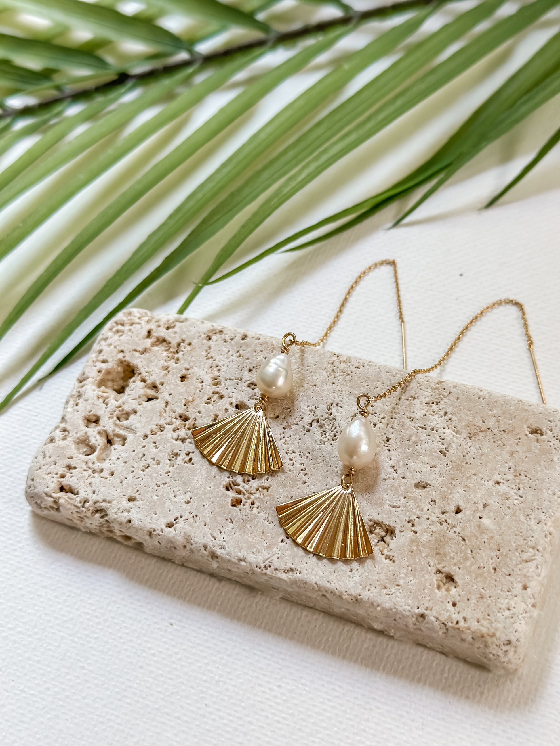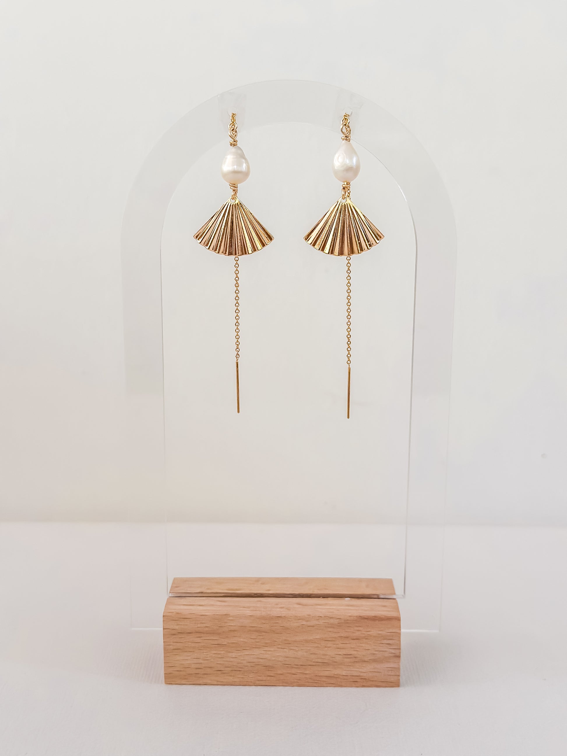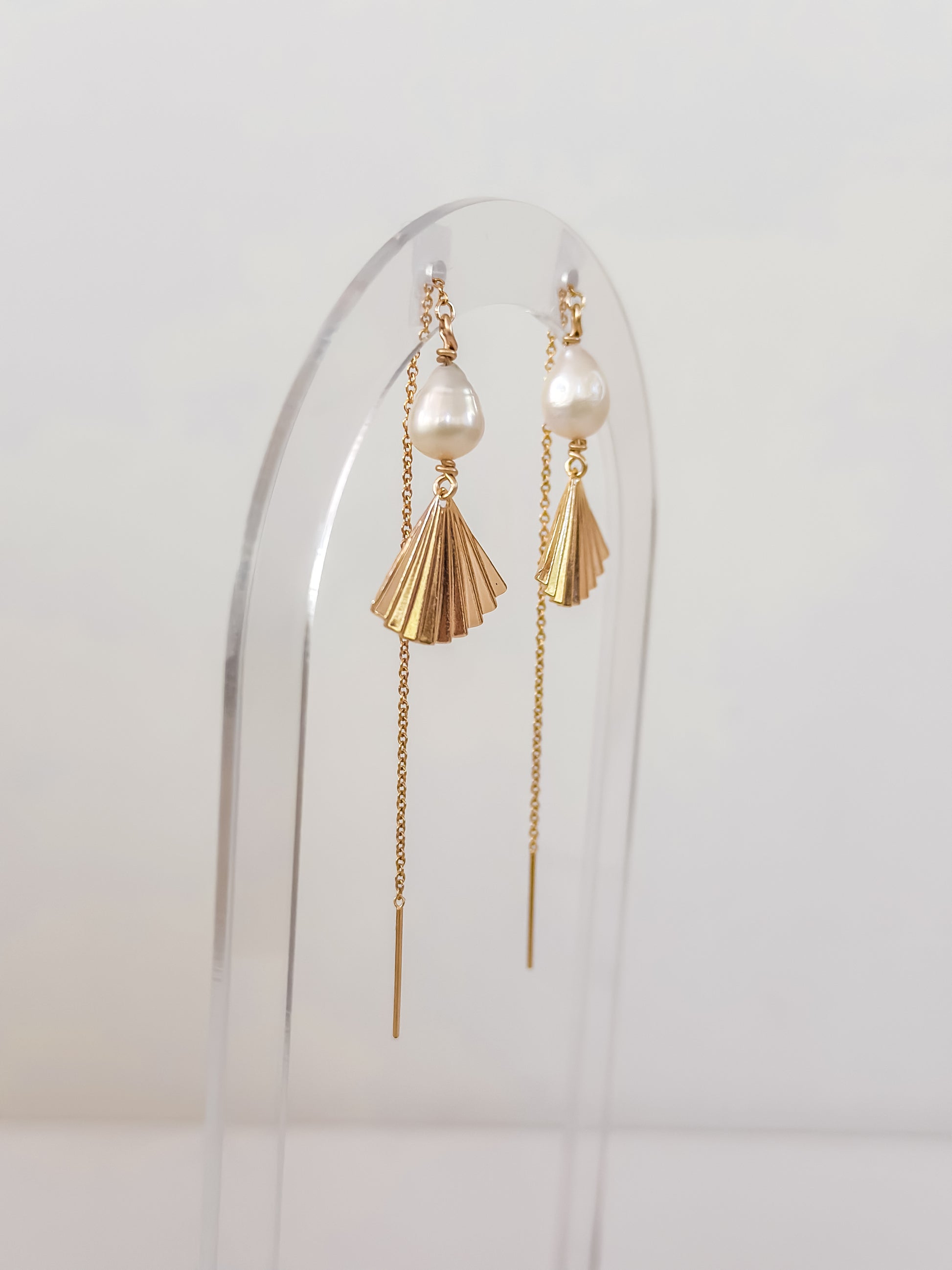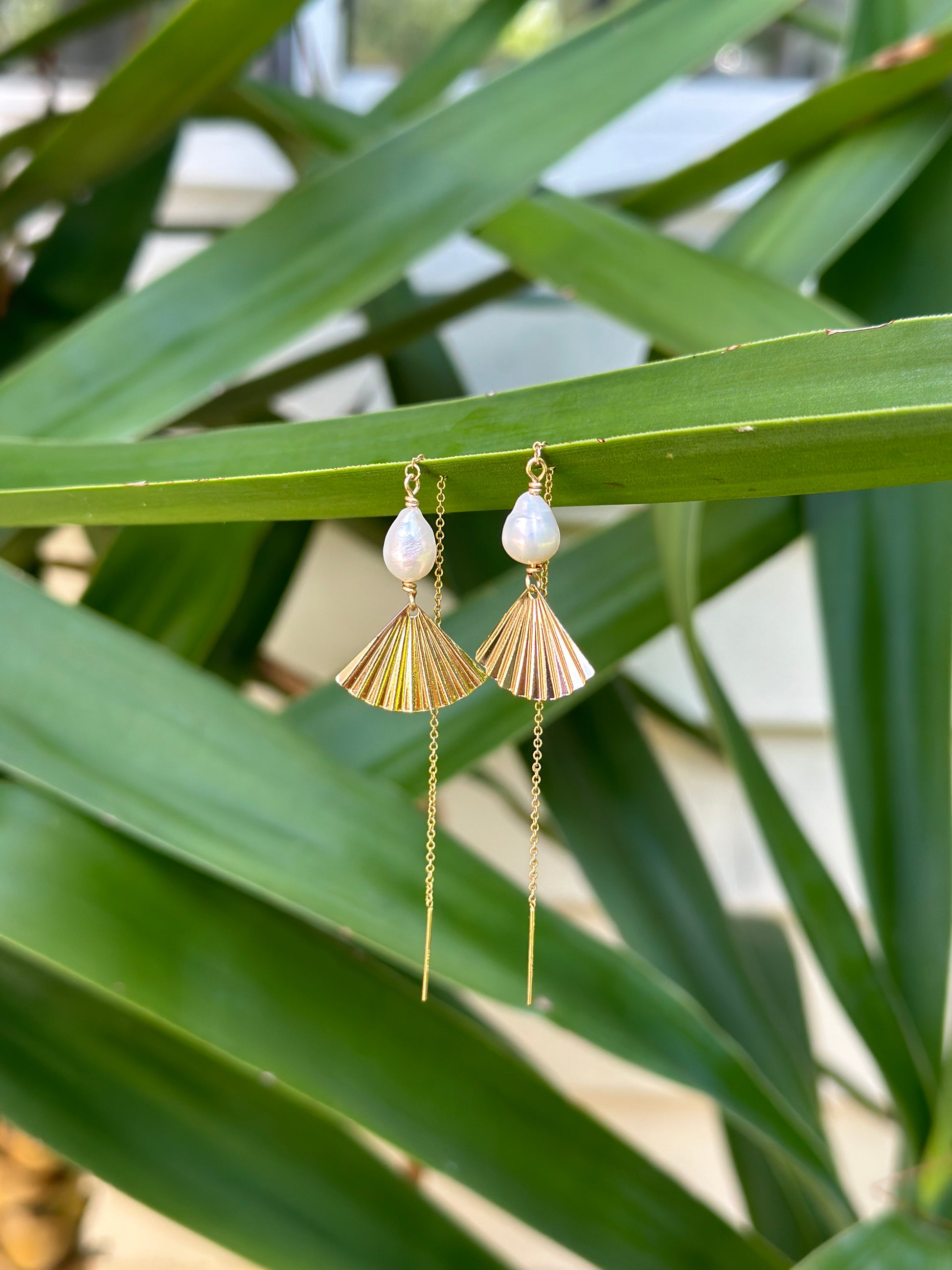 Golden and radiant, the Soleil Earrings are a statement in movement and light. Featuring a baroque pearl, flared fan charm, and a threader drop, they dance with every turn of your head. Elegant, unexpected, and full of shine. Wear in one piercing or two!